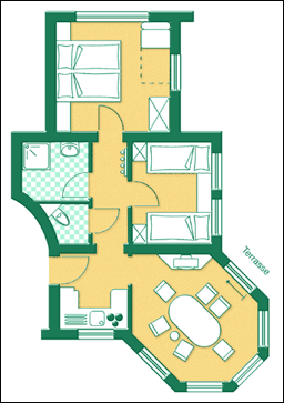 Das Appartement 4 hat 65 m² und zwei Schlafzimmer (1 Doppelbettzimmer, 1 Einbettzimmer mit Ausziehcouch) ist mit einem großen Balkon und einem großen Abstellraum ausgestattet. Weiters gibt es einen freundlichen Wohnbereich mit Küche, Essbereich und einem Bereich mit einem ausziehbahen Schlafsofa und TV.